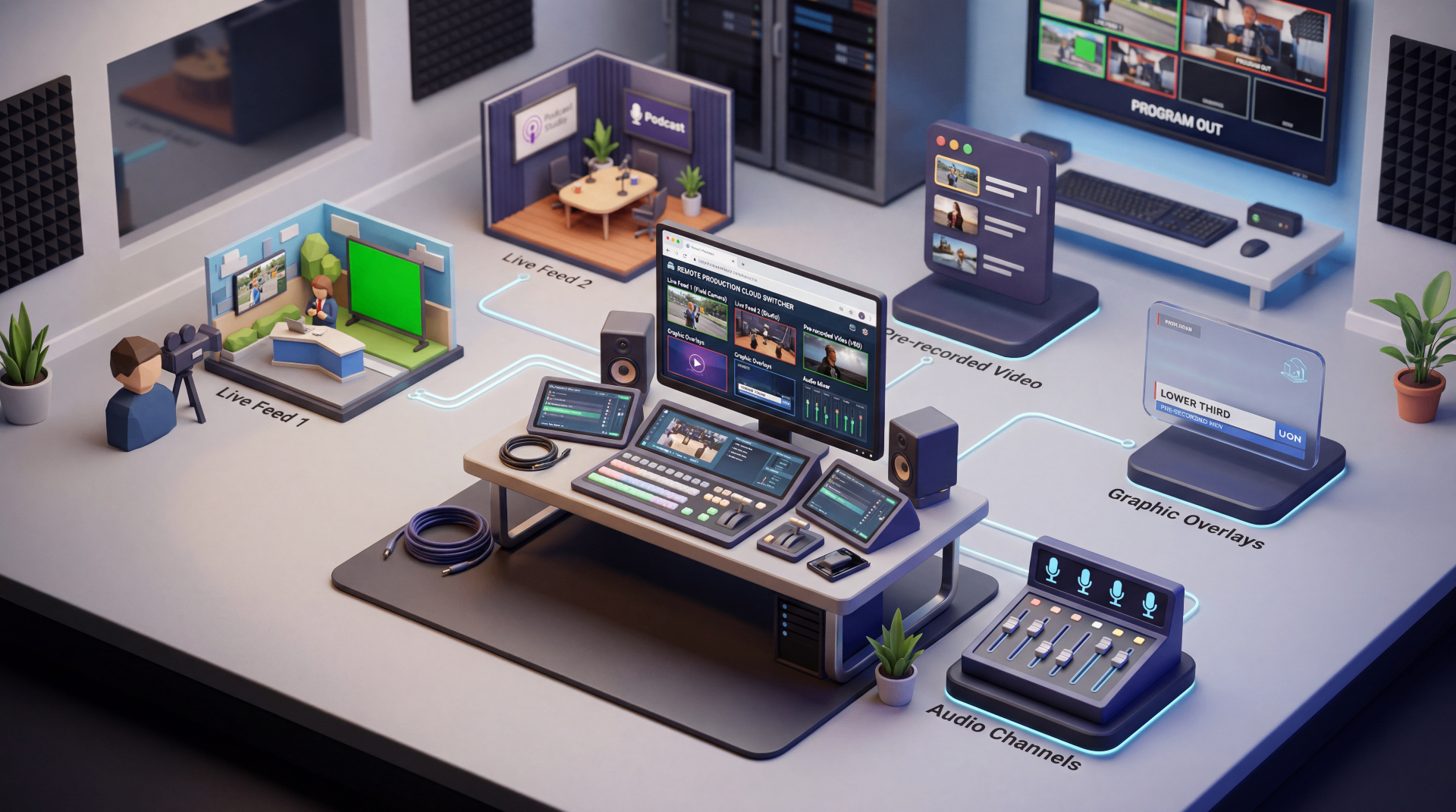In Summary: We do all the video switching, audio switching and add graphics - then live stream to Facebook, YouTube and other RTMP Platforms.